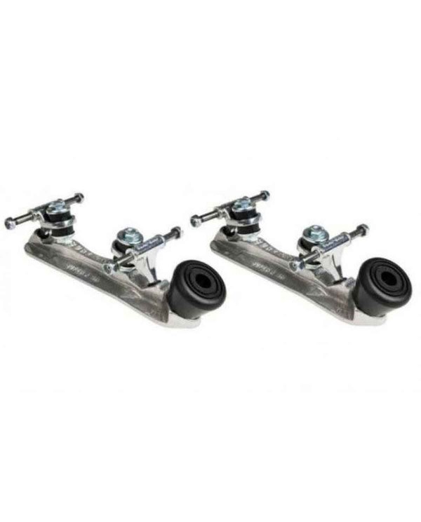 The Sure Grip Super X Aluminum plate has 10-degree double-action aluminum trucks with 8mm steel axles, USA urethane black 85a cushions, grade 8 steel kingpins, USA made black Bullseye rubber stops (fixed stops).