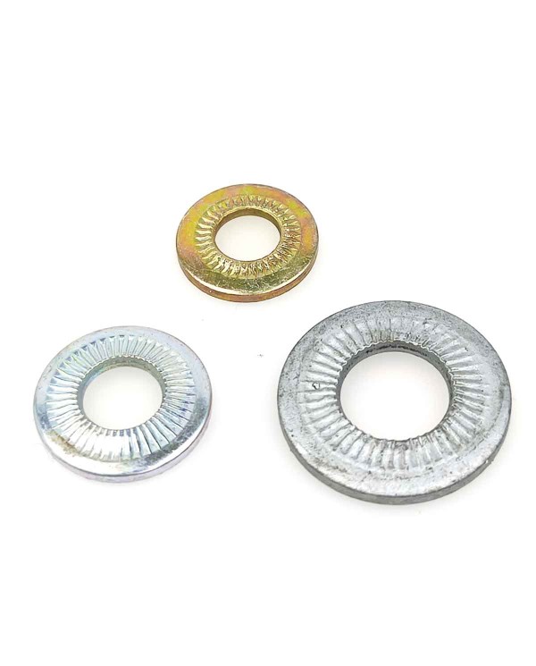 Estas arandelas son cóncavas y estriadas en una cara, de manera que hacen presión y se clavan en la cabeza del tornillo evitando que este puede desenroscarse.